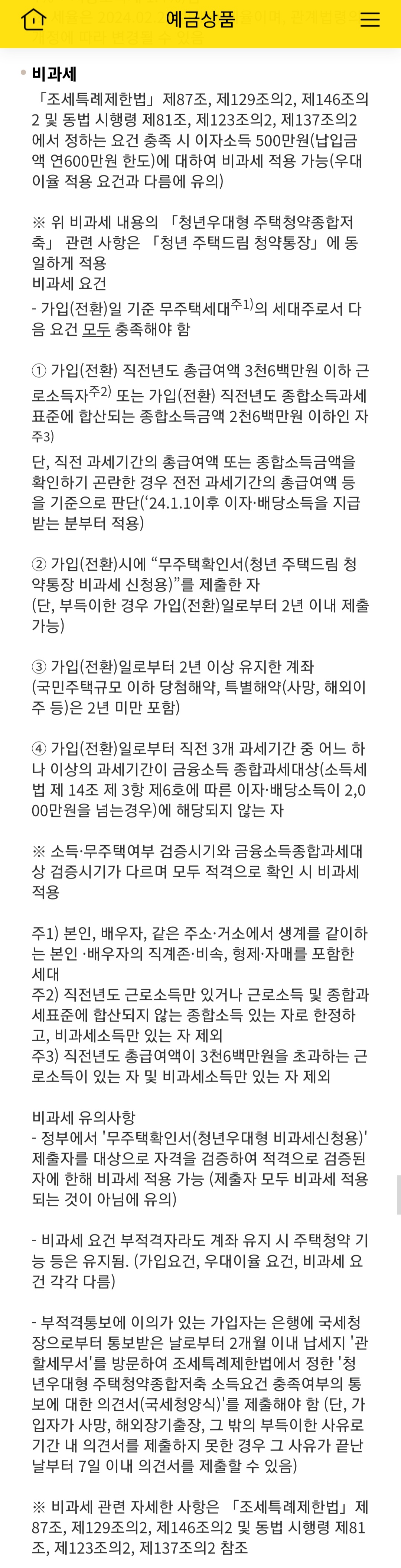 - 비과세 요건 부적격자라도 계좌 유지 시 주택청약 기능 등은 유지됨. (가입요건, 우대이율 요건, 비과세 요건 각각 다름)